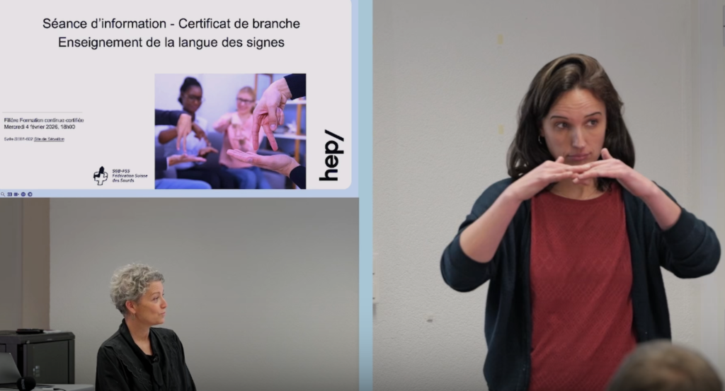 La séance d’information du 4 février a suscité un grand intérêt : environ 40 personnes y ont participé, sur place à Lausanne ou en ligne. La nouvelle formation continue pour devenir enseignant·e de Langue des Signes Française (LSF), développée en collaboration avec la HEP Vaud, y a été présentée. Les personnes n’ayant pas pu y assister peuvent toujours en consulter le contenu via la vidéo de la séance.