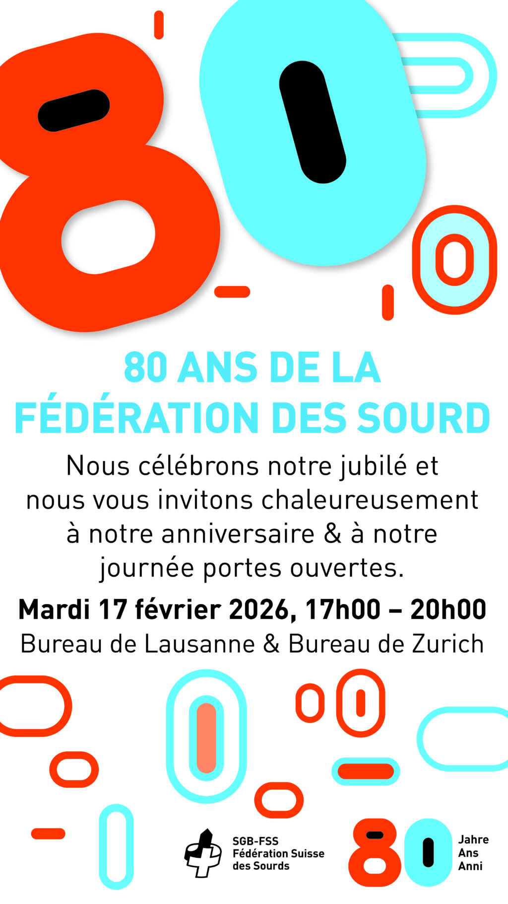 Le 17 février 2026, la Fédération Suisse des Sourds (SGB-FSS) fêtera ses 80 ans. Nous souhaitons célébrer cet anniversaire particulier avec vous – un moment de rencontre, d’échanges informels, de discussions et de rétrospective commune.