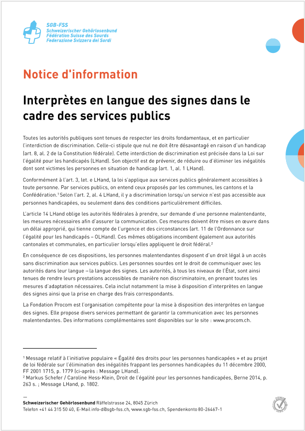 Notice d’information: Interprètes en langue des signes dans le cadre des services publics