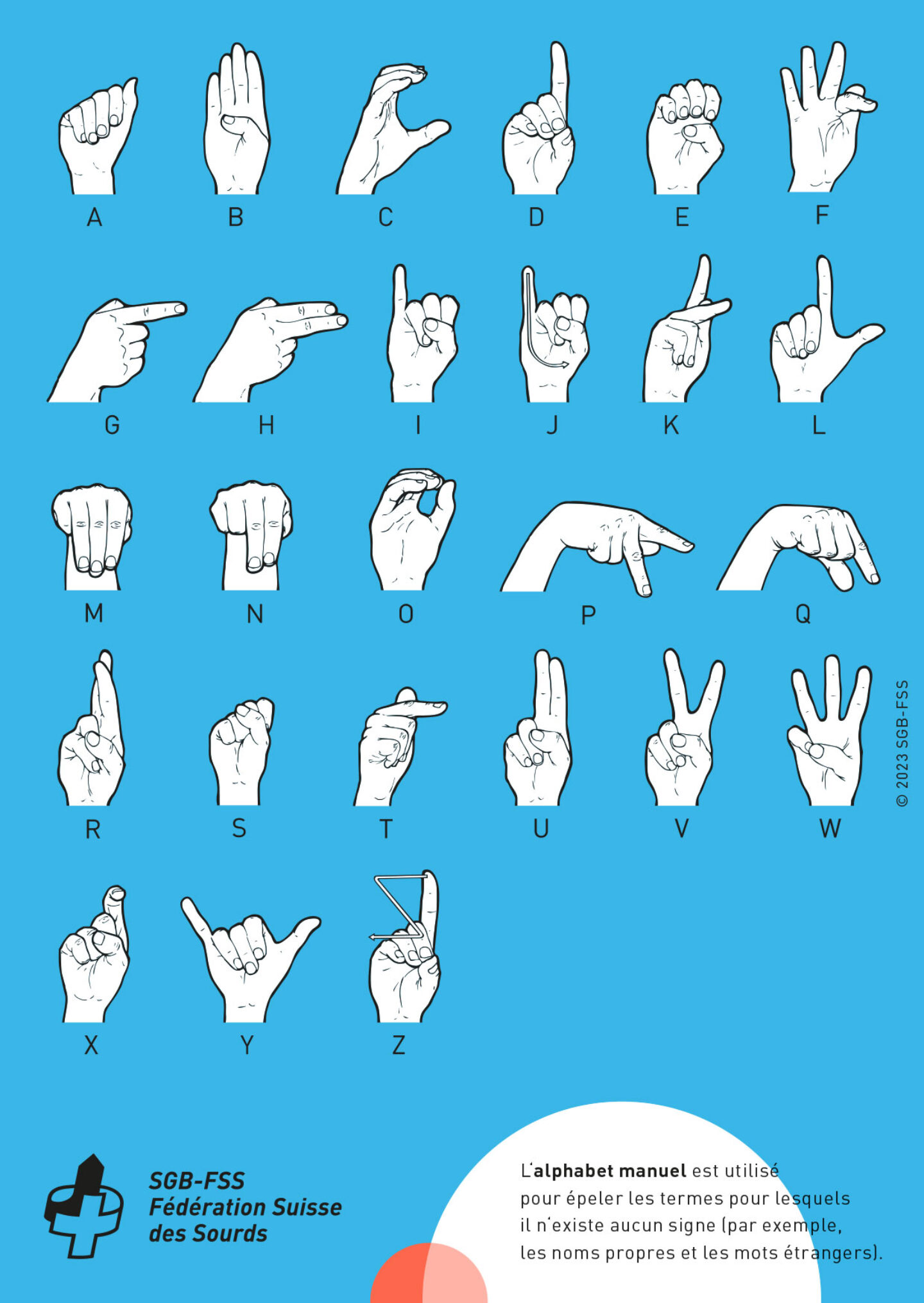 L’alphabet manuel est souvent utilisé pour épeler des mots étrangers ou des noms en langue des signes. Il s’utilise également lorsqu’il n’existe pas encore de signe pour un terme.