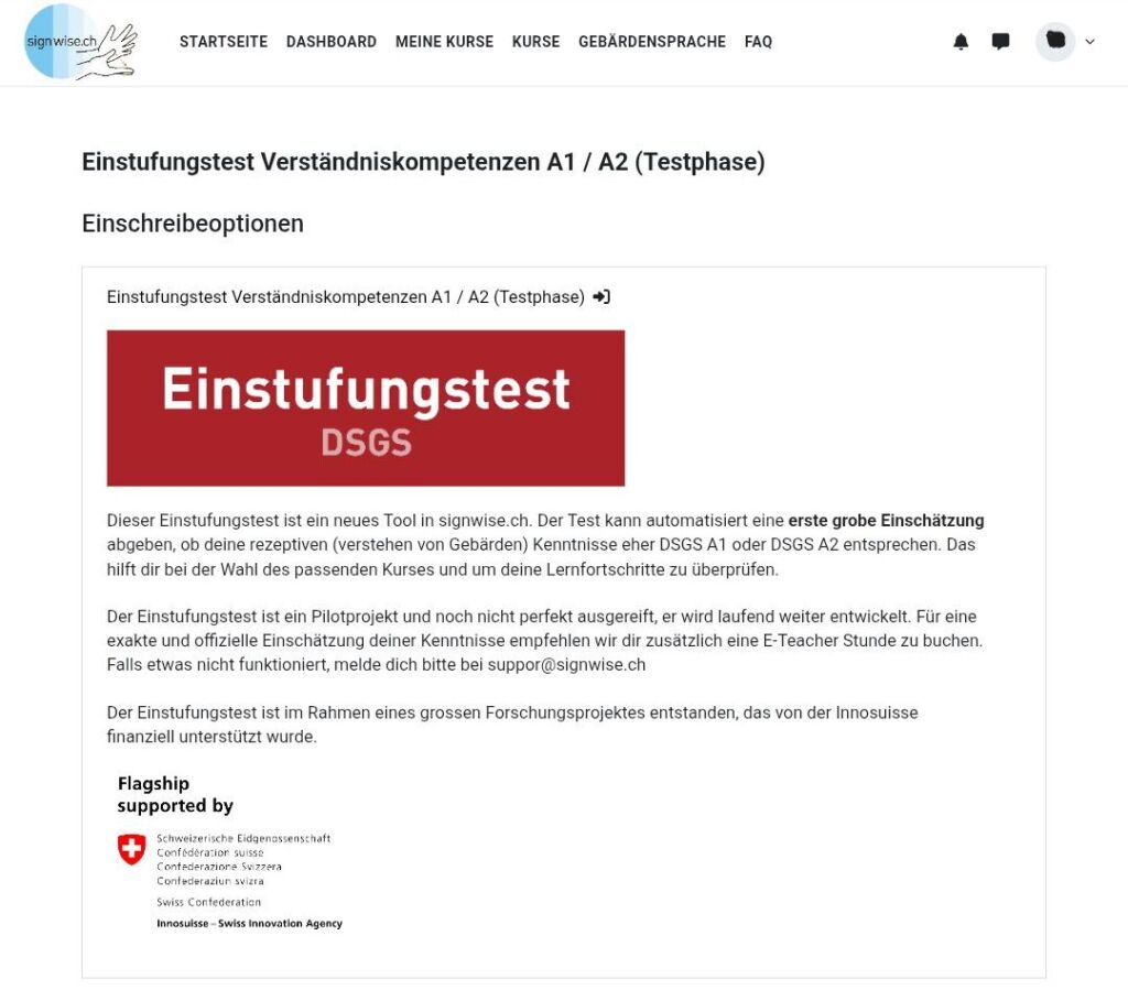 signwise.ch amplia la propria offerta con una nuova funzione innovativa: da subito è disponibile per tutti gli utenti un test di livello automatizzato e gratuito. Questo consente di valutare in modo approssimativo le competenze ricettive nella lingua dei segni della Svizzera tedesca (DSGS) ai livelli A1 e A2.